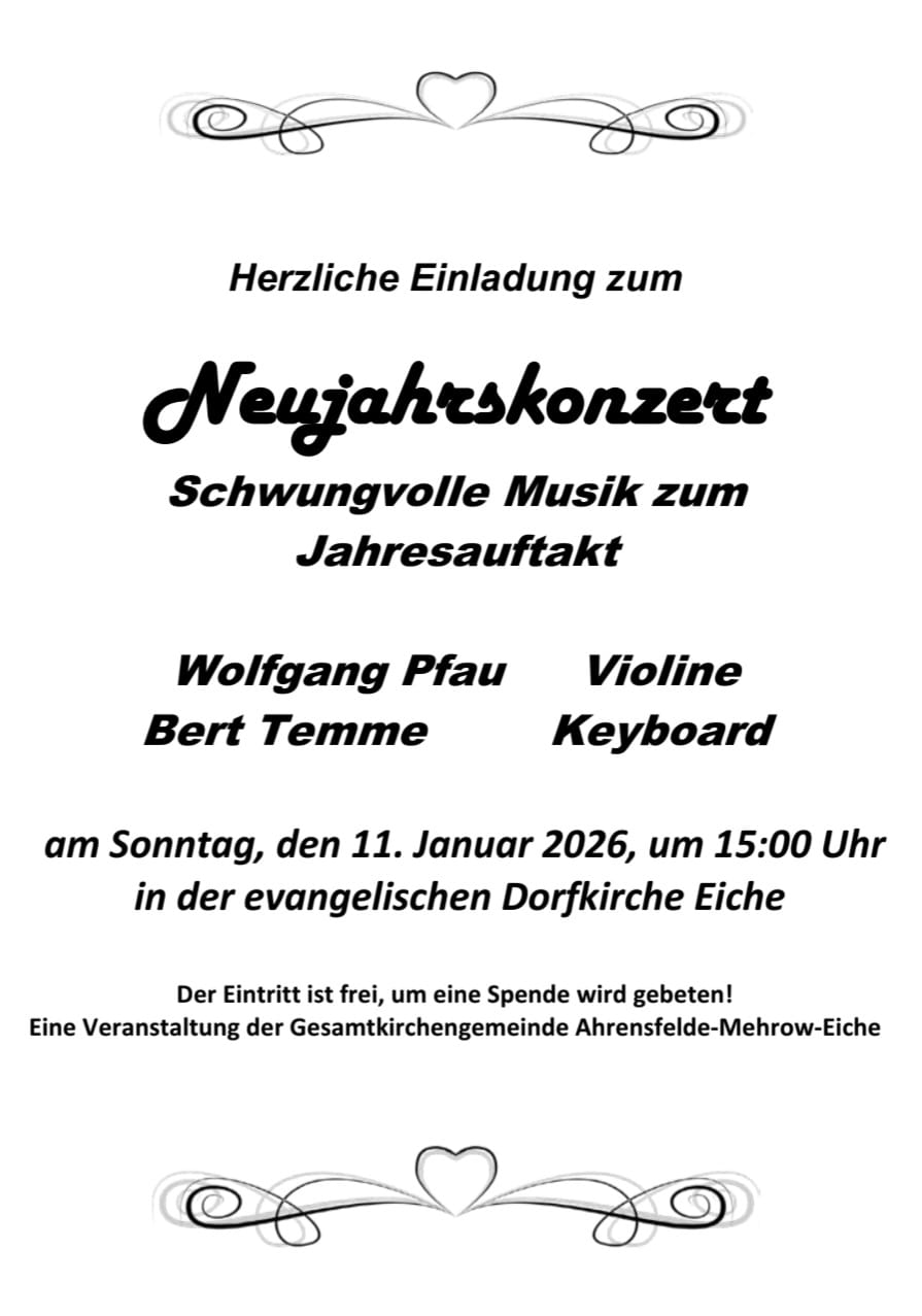 Am Sonntag dem 11.01.2026 um 15:00 Uhr findet in der Dorfkirche Eiche eine Neujahrskonzert statt.
